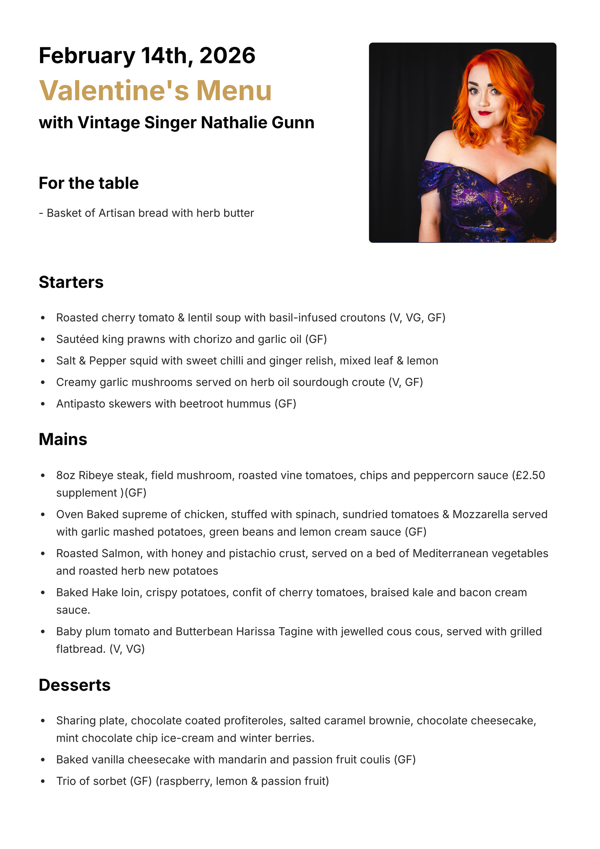 Perfect for a memorable night with your loved one, tickets £40 a head including dinner and sets from Vintage Singer Nathalie Gunn.